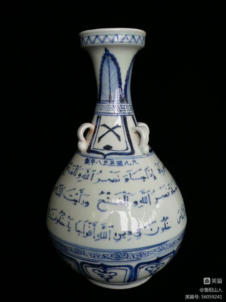 2.玉壺春瓶(見(jiàn)附圖)黑褐釉色,園腹、長(zhǎng)頸、撇口、圈足,高約30厘米,器型端莊大氣,腹部前后書寫同款阿拉伯文字,工藝同上。經(jīng)辨認(rèn)該組文字意為:“安拉乎”,意真主至大。